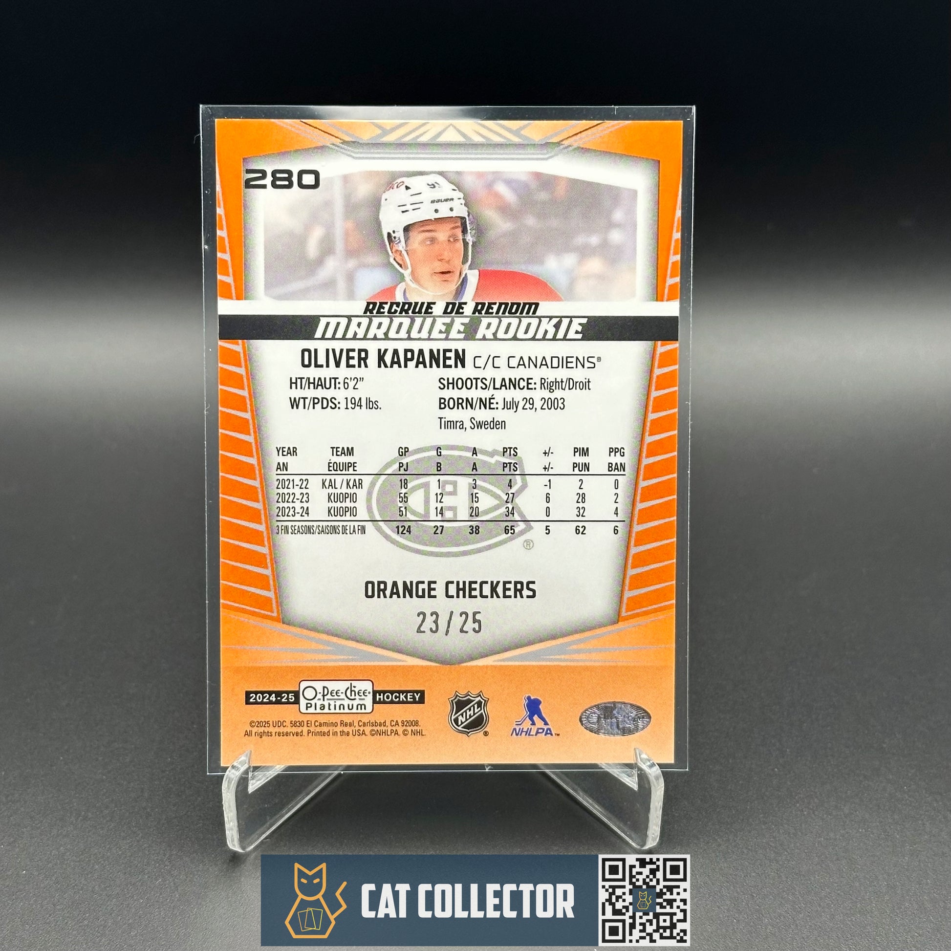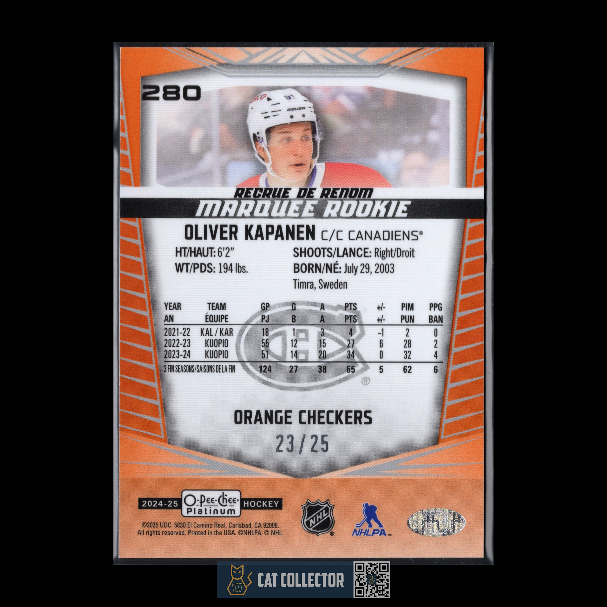 2024-25 OPC Platinum OLIVER KAPANEN #280 Marquee Rookie Orange Checkers RC /25