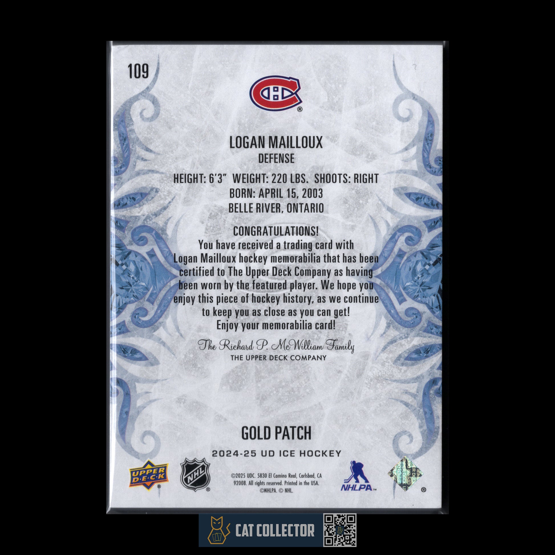 2024-25 Upper Deck Ice LOGAN MAILLOUX #109 Gold Patch RC /35