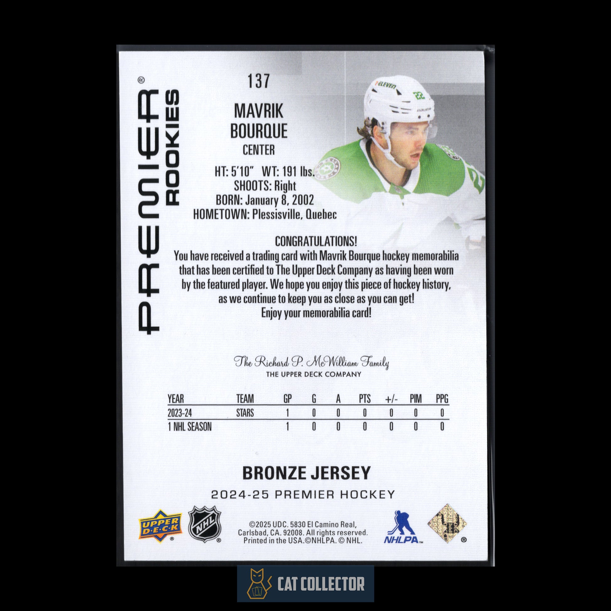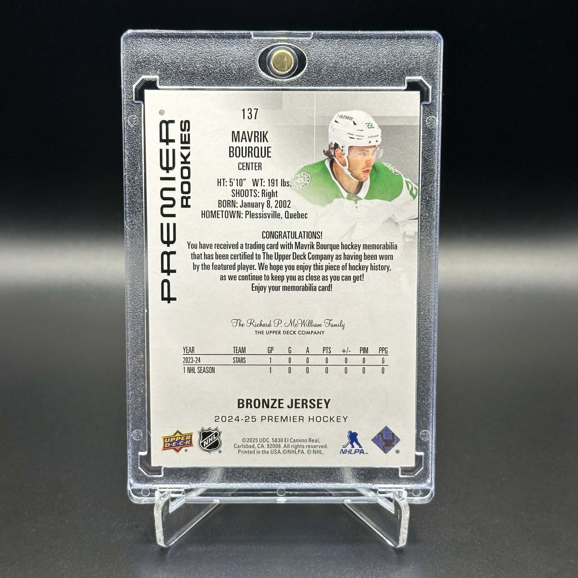 2024-25 Upper Deck Premier MAVRIK BOURQUE #137 Bronze Jersey Rookie RC